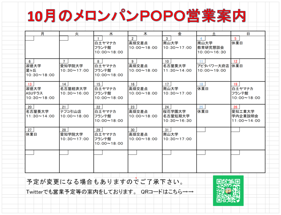 10月のメロンパンキッチンカーの販売予定です。天候等の理由で急遽お休みになる場合がございますのでその点はご了承ください。