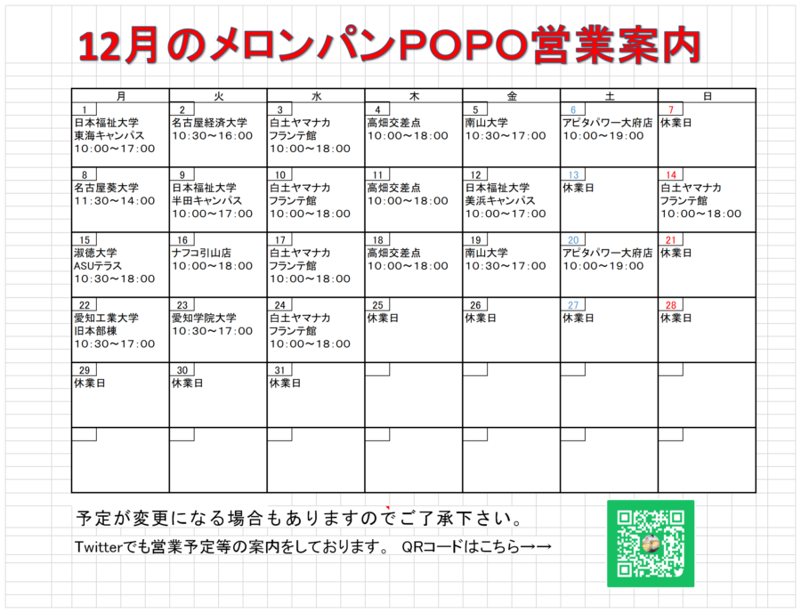 11月のメロンパンキッチンカーの販売予定です。天候等の理由で急遽お休みになる場合がございますのでその点はご了承ください。